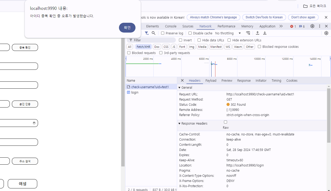 이 오류는 Spring Security의 기본 설정에 의해 발생하는 문제로, 특정 경로에 대해 인증 없이 접근하려고 시도할 때 발생합니다. /check-username 경로는 로그인 페이지로 리다이렉트되고, 서버는 클라이언트에게 302 상태 코드와 함께 로그인 페이지로의 이동을 요구하게 됩니다.