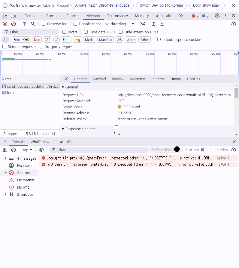만약 permitAll을 처리하지 않으면 json형식으로 반환 받기 위해 보낸 요청이 json 형식이 아니라 에러페이지를 반환해