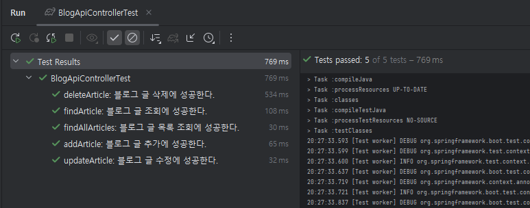 테스트 코드를 실행해보면 다음과 같이 테스트가 성공한 걸 확인 할 수 있습니다.