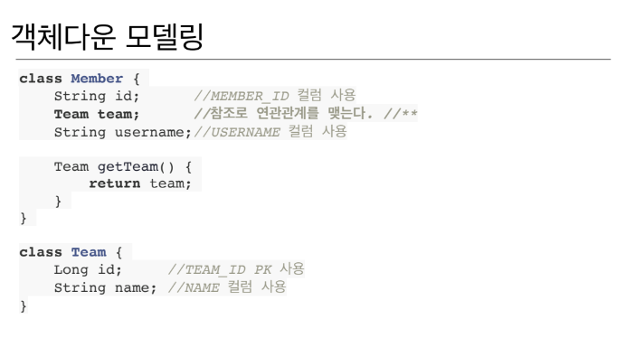 만약 멤버객체랑 팀 객체를 테이블에 저장을 한다고 할 때 객체를 테이블에 맞춰서 모델링을 많이 하게 된다.