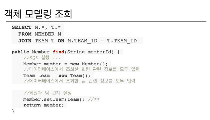 만약에 객체에서 참조관계인 Team의 ID를 가져올려고 이렇게 insert문을 구성하였다. 하지만 이렇게 되면 문제가 생긴다. 맴버 객체를 보면 멤버 클래스에 지금 팀에 대한 참조만 있지 팀의 아이디가 없는 상태가 된다. 여기서 팀의 아이디를 가져올려면 멤버에서 멤버 아이디를 조회한 뒤 그걸 이제 가져와야한다. 조회 할 때도 마찬가지로 훨씬 복잡해진다.