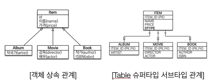 기존방식으로 아이템이랑 엘범을 슈퍼타입 서브타입으로 테이블을 설계하게 되면 아이템 객체 인스턴스를 데이터 베이스에 저장을 할려면 인서트 쿼리를 아이템 테이블과 Album테이블에 모두 넣어야 합니다. 데이터가 나뉘어있기 때문에 insert쿼리를 두개를 작성을 해서 데이터를 저장하게 됩니다. 하지만 jpa를 이용하여 상속 저장을 하게 되면 엘범데이터를 넣을 때 insert구문 하나로 아이템 테이블에도 넣고 엘범테이블에도 데이터를 넣을 수 있게 됩니다. 왜냐하면 객체 상속 관계를 이용하여 데이터를 처리하기 때문입니다.